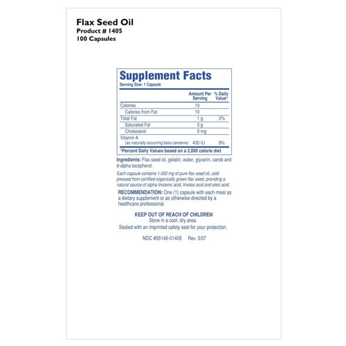 Each softgel capsule contains 1,000 mg of pure flax seed oil, cold pressed from certified organically grown flax seed, providing a natural source of alpha linoleic acid and oleic acid.