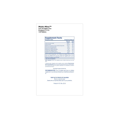 Iron and copper free version of Multi-Mins. Provides a balance source of mineral chelates and whole food, phytochemically bound trace minerals, with Betaine HCI to facilitate absorption, combined with the antioxidant enzymes SOD and catalase. Use wherever multi-mineral supplementation is indicated.