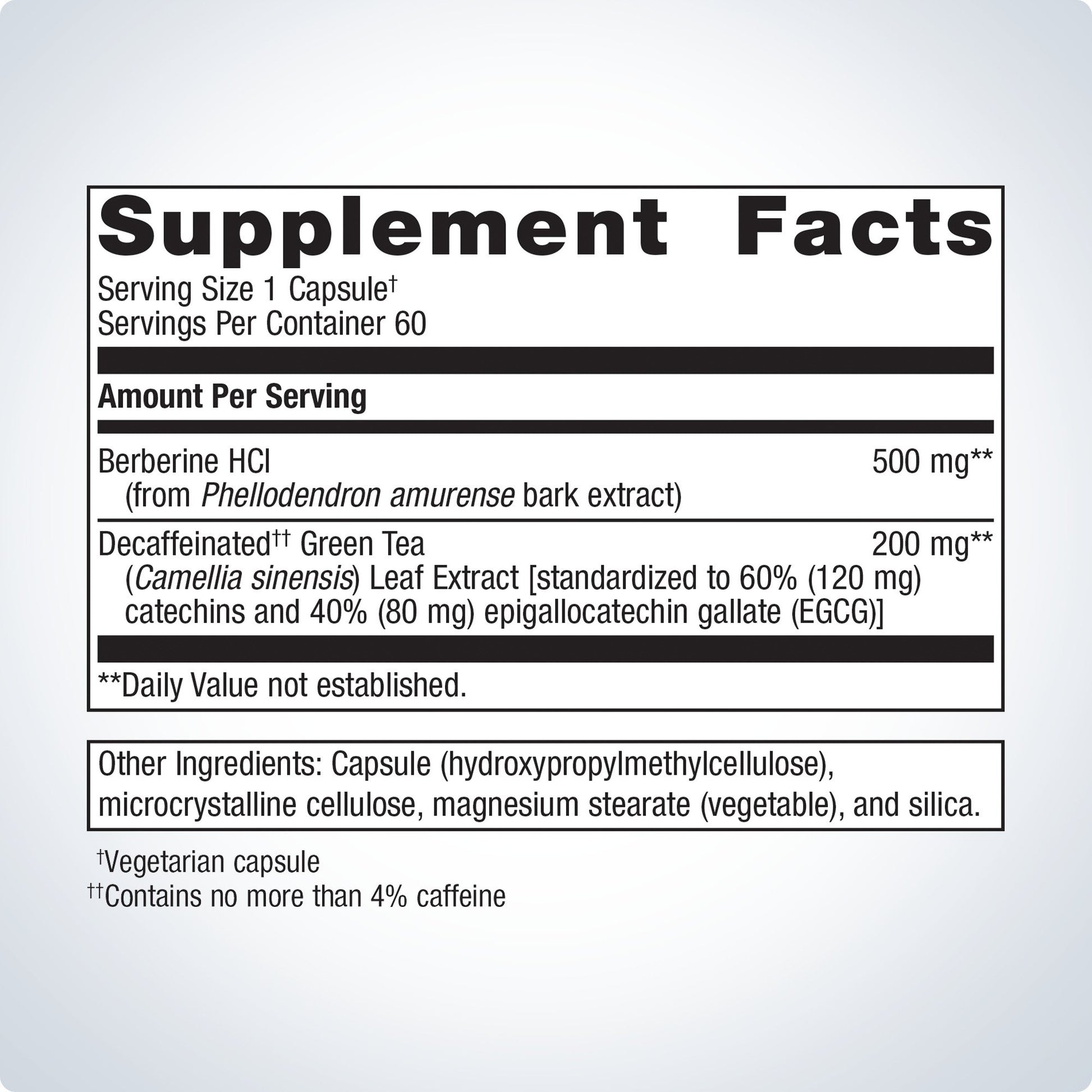 Berberine GT is a dual-action formula that supports heart health, weight management, and healthy glucose metabolism. It contains 500 mg of Berberine HCl, the most researched form of Berberine, with 200 mg of decaffeinated green tea.